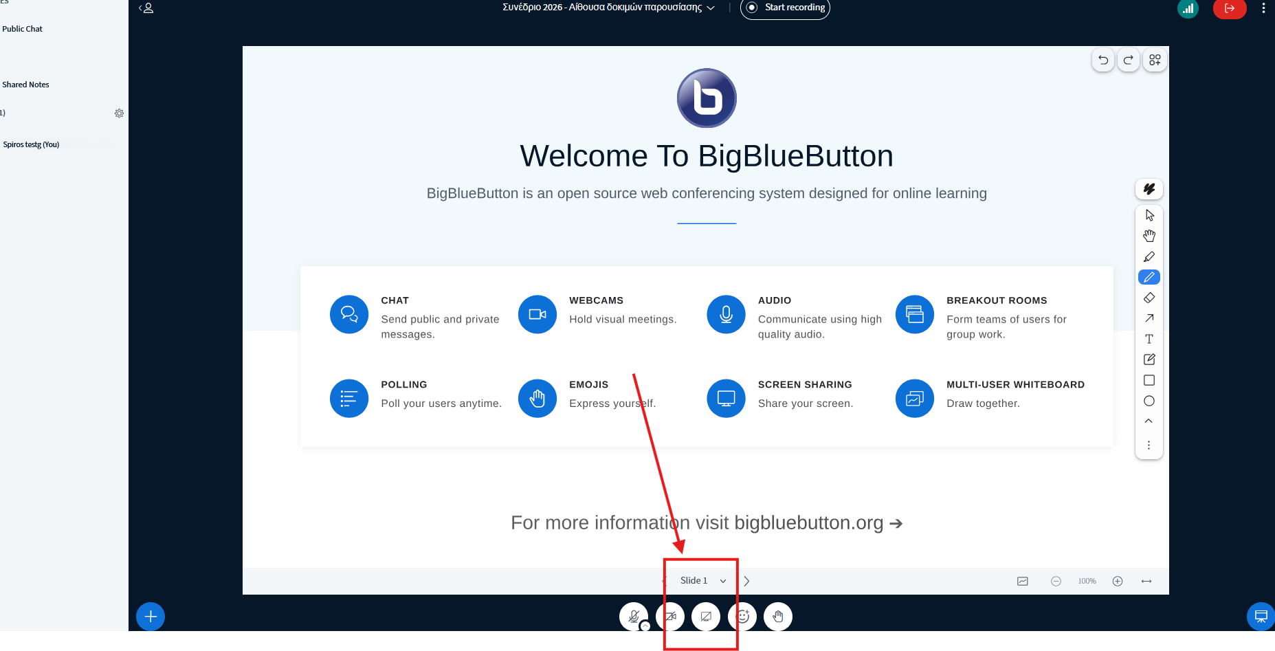 ✓ Εξοικείωση με την πλατφόρμα BigBlueButton και την τηλεδιάσκεψη.